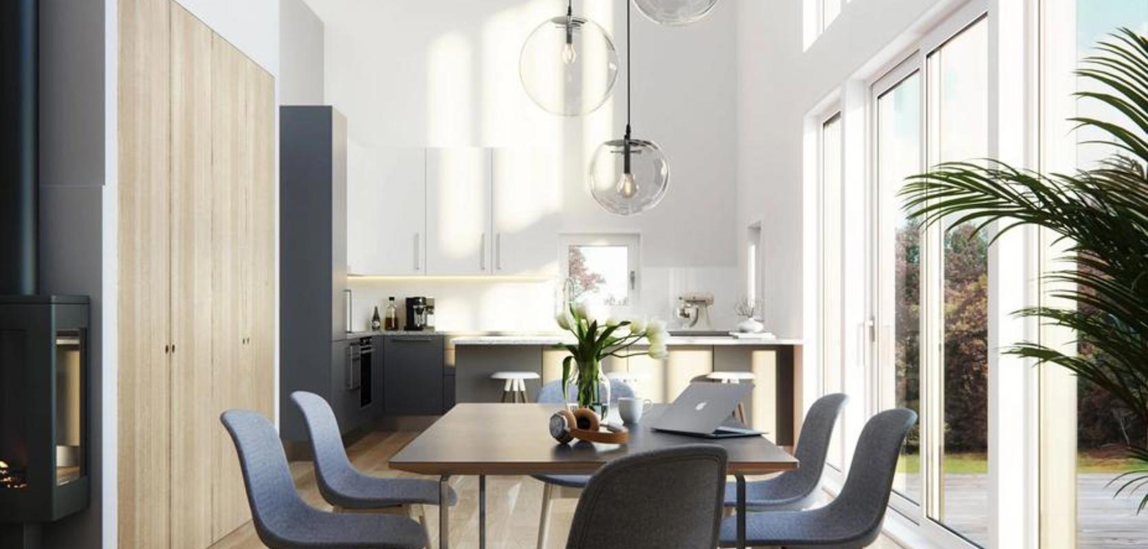 Mønet på saltaket er forskjøvet i forhold til midten av taket. Dette gir boligen et moderne og originalt utrykk, og gir også rom for en større takhøyde i andre etasje.