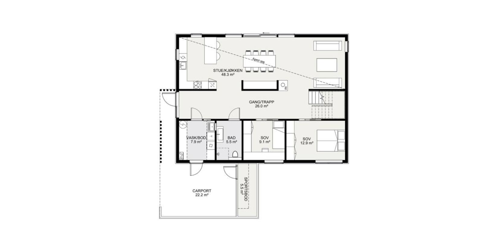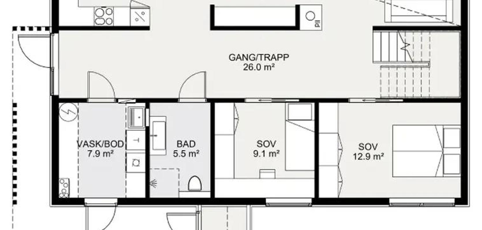 I inngangsplanet finner du en privat sone med soverom og bad. I tillegg ligger et stort og praktisk vaskerom rett ved inngangsdøra. Vaskerommet fungerer som bi-inngang til boligen. Perfekt å kunne gå rett inn her når barna kommer hjem med vått og skittent tøy.