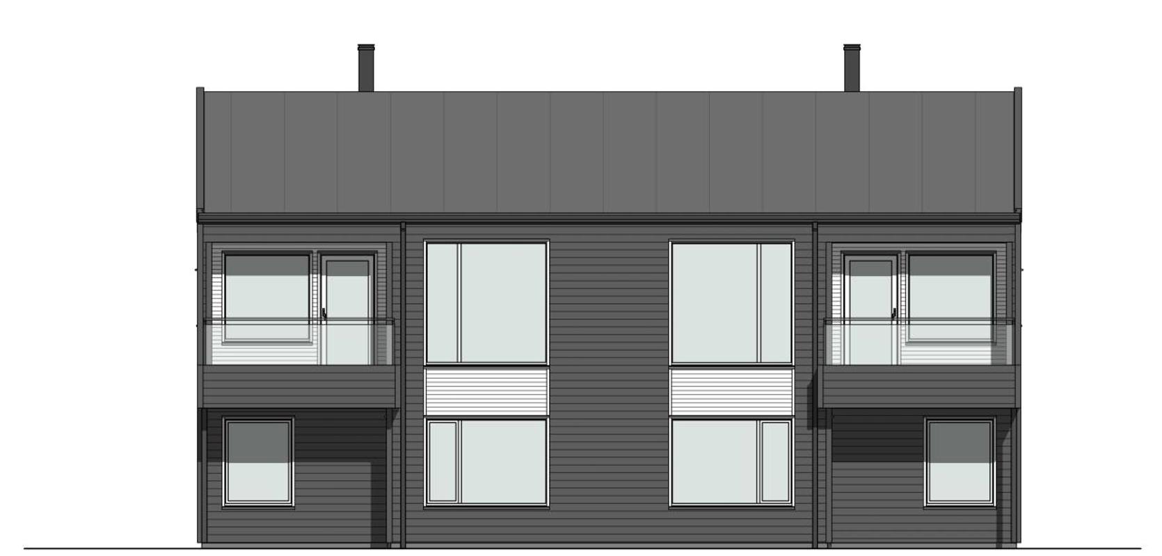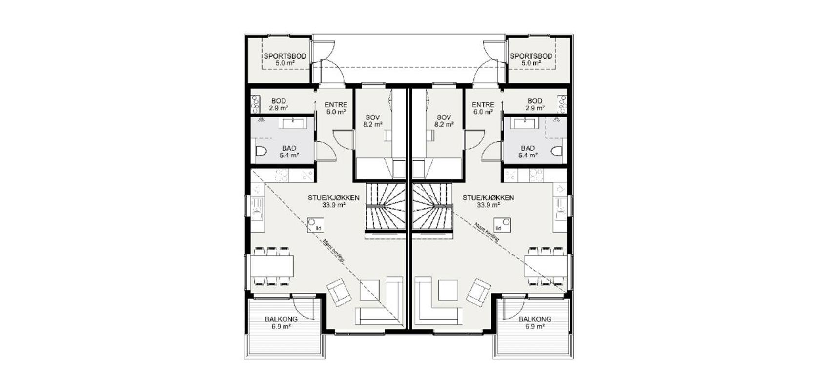 Begge boenhetene er speilvendte og har skjermede balkonger på hver side. I tillegg har hver enhet sitt eget herlige, private uteområde på bakkeplan. En annen fordel er at huset er spesialtilpasset for en skrå tomt, slik at du kan få inngang i begge etasjene.
