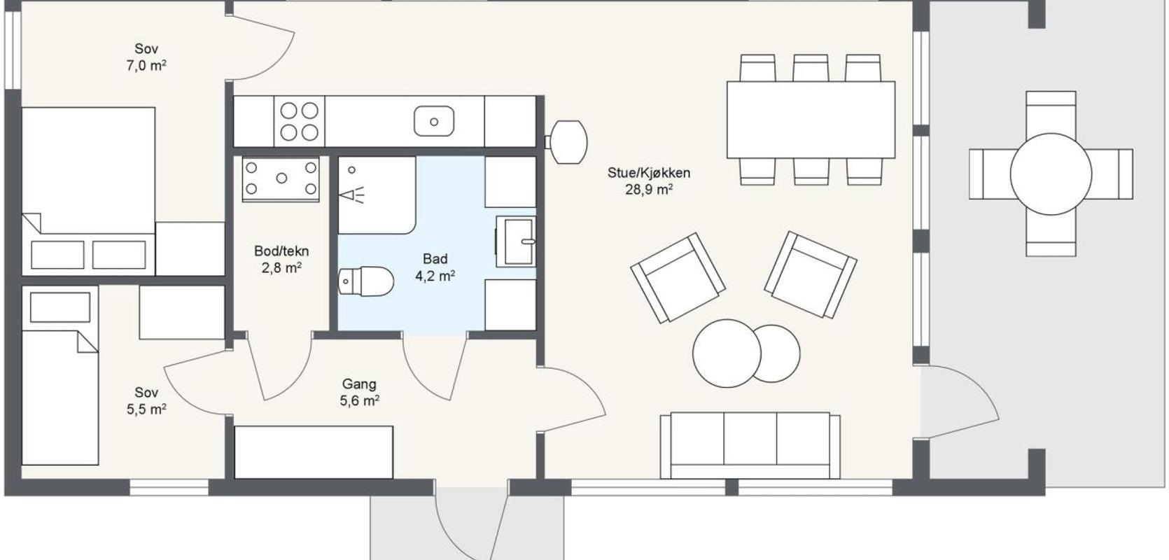 Blåtind har en praktisk planløsning. I entreen har du god plass til ytterklær, og herfra har man inngang til badet. Plassert ved siden av badet er en bod for teknisk utstyr. Når kjøkken, bad og teknisk rom danner en kjerne midt i hytta gir dette en samlet, praktisk og økonomisk løsning for de tekniske installasjonene.