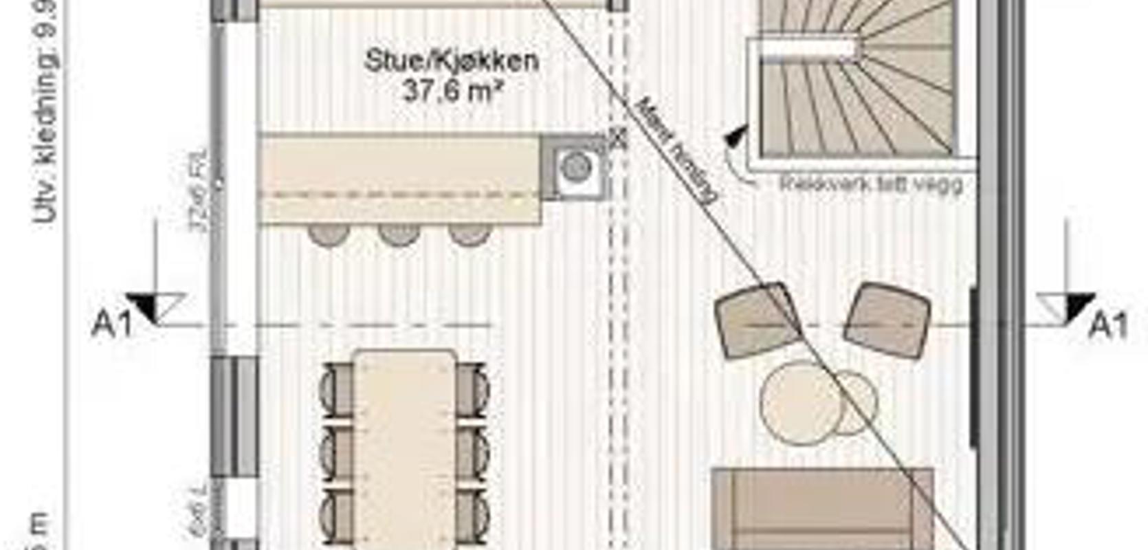 Stue/kjøkken er et godt rom med god takhøyde og perfekt for tomt med utsikt.