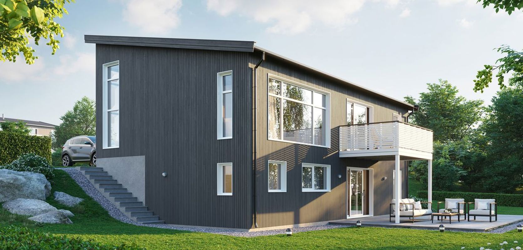 Hovin er en romslig bolig med en enkel og stilren fasade. Med BRA på 195 m², har denne boligen god plass til familien. Pulttaket gjør at huset skiller seg ut og gir en fantastisk takhøyde innvendig.