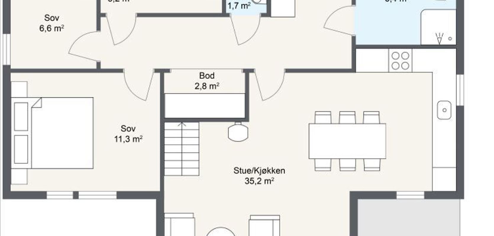 Første etasje har en åpen stue- og kjøkkenløsning med store vinduer som gir godt med lys og kontakt med naturen. Her er det plass til et stort spisebord og en koselig sofakrok. Fra oppholdsrommet kan man gå ut til en koselig utendørs krok, som kan være perfekt for frokost eller avslapping mens du nyter solnedgangen på kvelden.